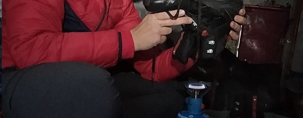 Po rozłożeniu materacy i śpiworów przystąpiliśmy do suszenia rzeczy. Jednak przy tak dużej wilgotności, nie było to zbytnio możliwe. Robimy więc coś ciepłego do jedzenia i idziemy do śpiworów się zagrzać. Przed nami jutro ostatni dzień i mimo braku suchych rzeczy, nic nam nie przeszkodzi to ukończyć. Przecież jakoś trzeba stąd zejść :)