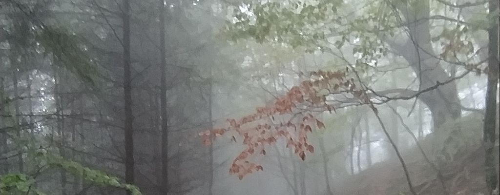 Dopiero poniżej 1200 m n.p.m. pojawił się liściasty las. Bardzo tajemniczy - częściowo zamglony. Najważniejsze jednak że już nie wiało.