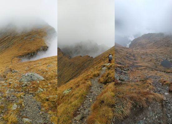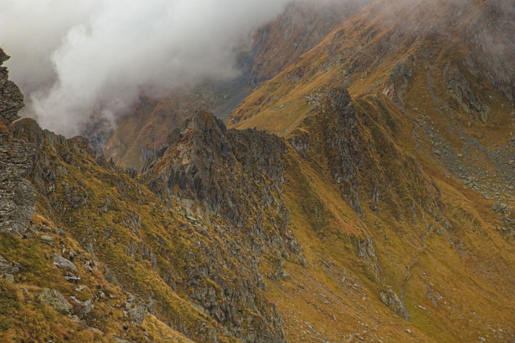 Idziemy więc z tymi plecakami po mokrej skale w zimnym wietrze, ostrą granią (Custura Sărăţii). Czerwony szlak biegnący tą granią okazał się być najtrudniejszym szlakiem w Fogaraszach i całej Rumunii. Na szczęście nie rozpraszały mnie widoki, a byłyby pewnie bardzo ładne.