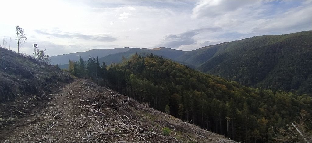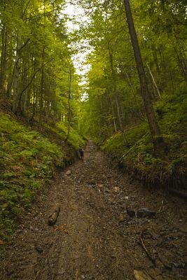 Jeszcze przed wyjściem w góry zatrzymujemy się na mały posiłek. Uzupełniamy kalorie i ruszamy w drogę. Pierwsze kilometry idziemy drogą wznoszącą się lekko w górę. Trudnościami przypominającą tą w Dolinie Kościeliskiej na Ornak. Różnica jednak w tym, że zamiast kilkuset turystów spragnionych piwa i szarlotki w Ornaku, spotykamy jedynie kilkunastu. Po godzinie marszu dochodzimy do zabudowań, gdzie skręcamy w lewo. Droga jest nadal szeroka ale dochodzi mała trudność - błoto. Idziemy tak przez chwilę, skacząc z jednej na drugą nogę aby tylko ominąć kałuże i błoto. Ta chwila mogła być krótsza, gdybym spojrzał w czas na mapę. Jak to już zrobiłem to okazało się, że przeszliśmy już zejście. Na moje szczęście tylko trzysta metrów. Zawracamy więc i znajdujemy odbicie. Od teraz będziemy robić wysokość, podchodząc dość stromym, wyjeżdżonym przez leśników zboczem pełnym błota.