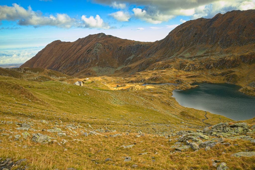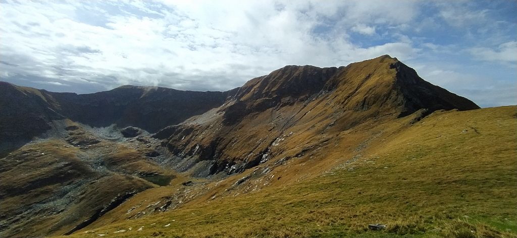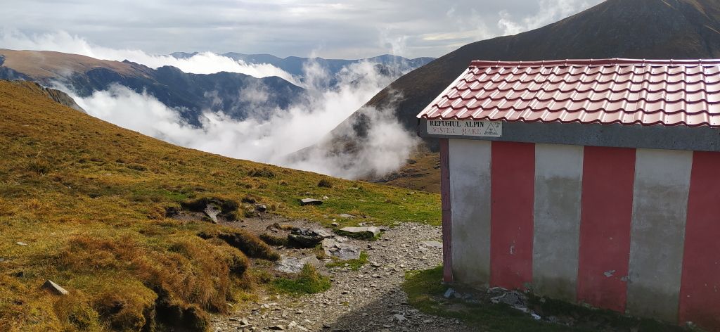 Cel na dziś to zboczyć ze szlaku dwa razy. Raz na Moldoveanu (2544 m n.p.m.) i pod koniec do schroniska przy Lacul Podragu. To pierwsze to też mój cel wyprawy. Kierując się w kierunku najwyższego szczytu Rumunii, cały czas towarzyszy nam wiatr, który co chwilę chowa i odkrywa przed nami panoramę gór. Tuż przed podejściem pod Vistea Mare (2535 m n.p.m.), dochodzimy do kolejnego schronu. Jest on w znacznie lepszym stanie. Zatrzymujemy się tutaj na chwilę aby trochę odpocząć.