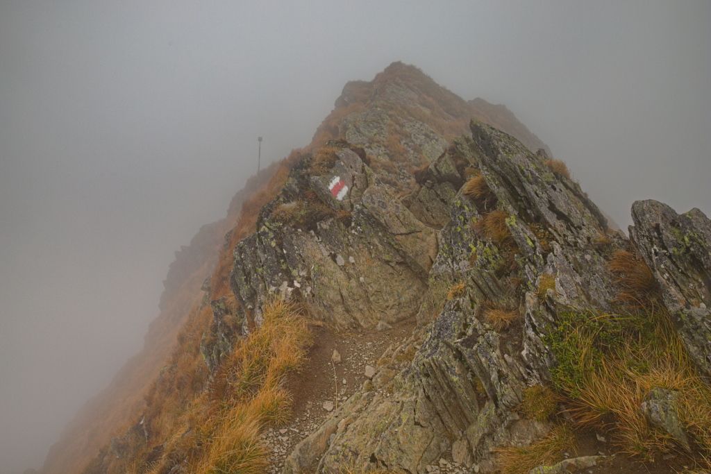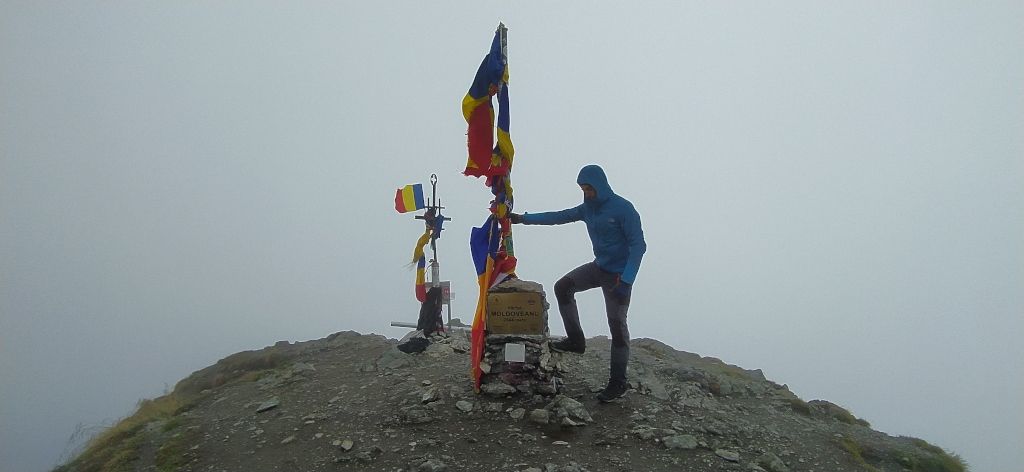 Po chwili przerwy zaczynamy wspinaczkę na Vistea Mare a następnie idziemy z jego szczytu granią w kierunku Moldoveanu. Te około czterysta metrów, to szlak z miejscami dość dużą ekspozycją i koniecznością wspinania się. Idąc tak zaczynam za bardzo o tym myśleć i w głowie mam już odwrót. Na szczęście za mną idzie Tomek i nie pozwala mi na to. Cały ten lęk nagle przemija na wierzchołku i powrót ze szczytu jest dla mnie banalny, a ekspozycja nie robi już na mnie wrażenia. Na szczycie jesteśmy, jak okolice pokryły już chmury. Sam szczyt wygląda jak mała wysepka na otwartym morzu.