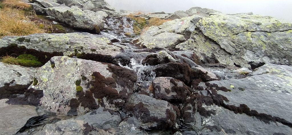 Szlak prowadzi po głazach, które są teraz bardzo mokre. Przecina kilka strumieni i dochodzi do stromego żlebu, który kończy się wspinaczką na przełączkę, po której następuje ostre zejście w dół. W normalnych warunkach nic trudnego, nawet z ciężkim plecakiem, ale mokra skała wymusza od nas wzmożoną koncentrację. Zaraz po zejściu mamy podejście do głównego szlaku. Przed nami ponowne pałowanie dwustu metrów w górę.
